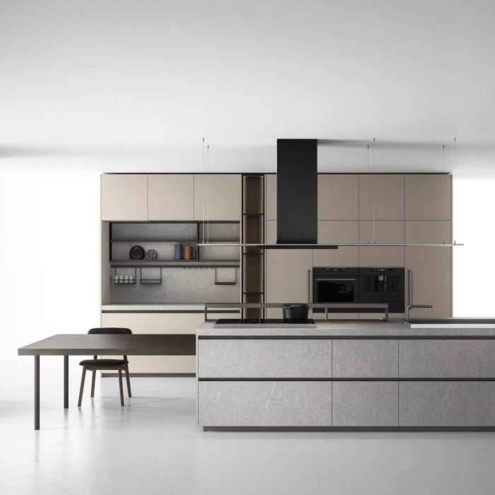 Una preferencia actual en el concepto de cocinas hechas a medida es el empleo de mecanismos sin manijas, que generan una estética más minimalista y moderna. Este tipo de herrajes, como los sistemas de apertura por presión, quitan la necesidad de mangos externos, lo que favorece un acabado más fluido y minimalista.